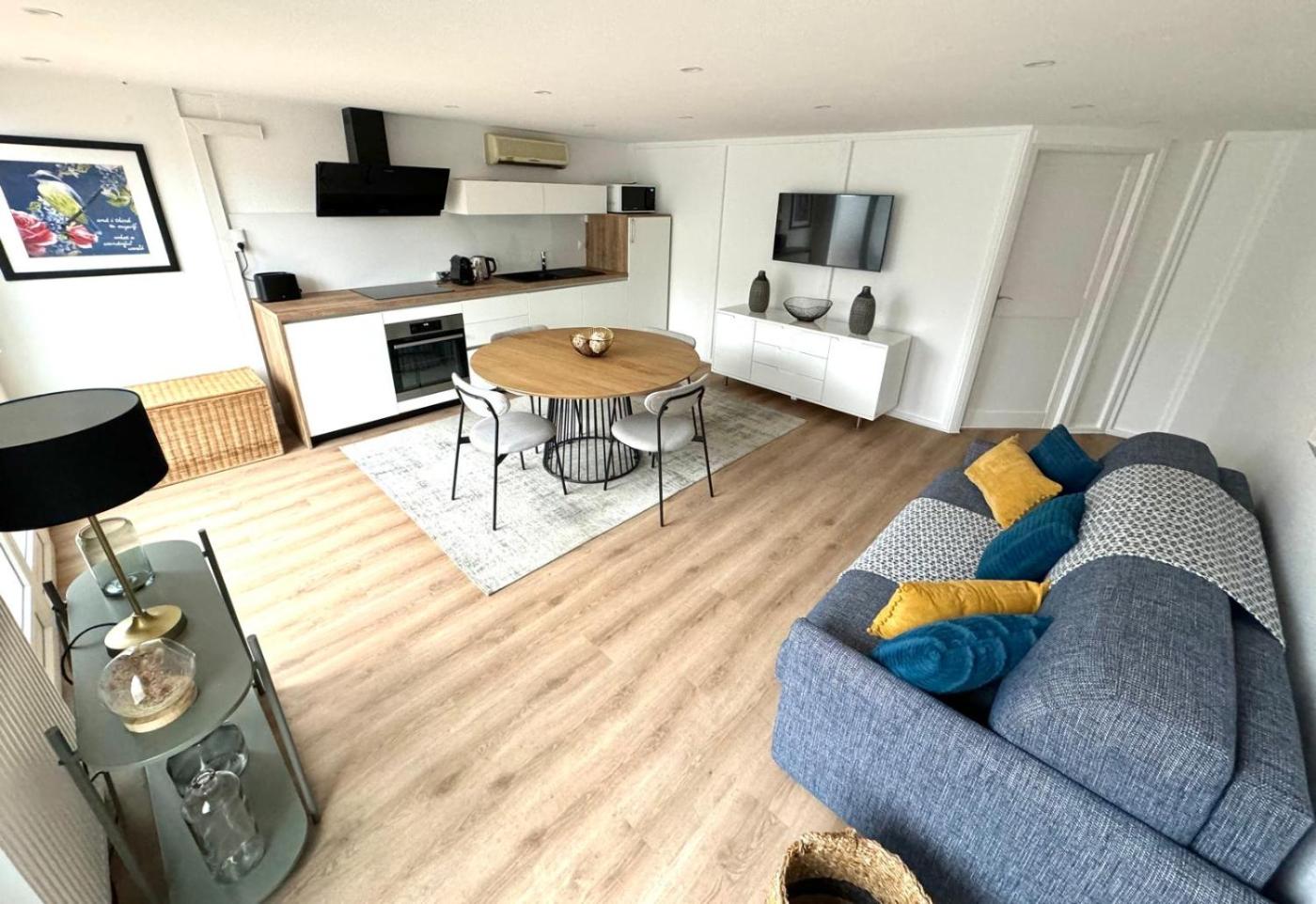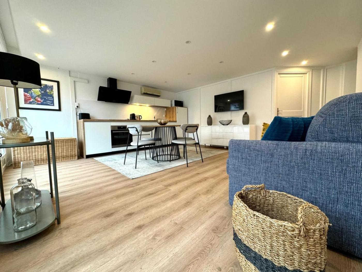 The apartment features a terrace, 1 bedroom, a living room and a well-equipped kitchen. A flat-screen TV is featured.