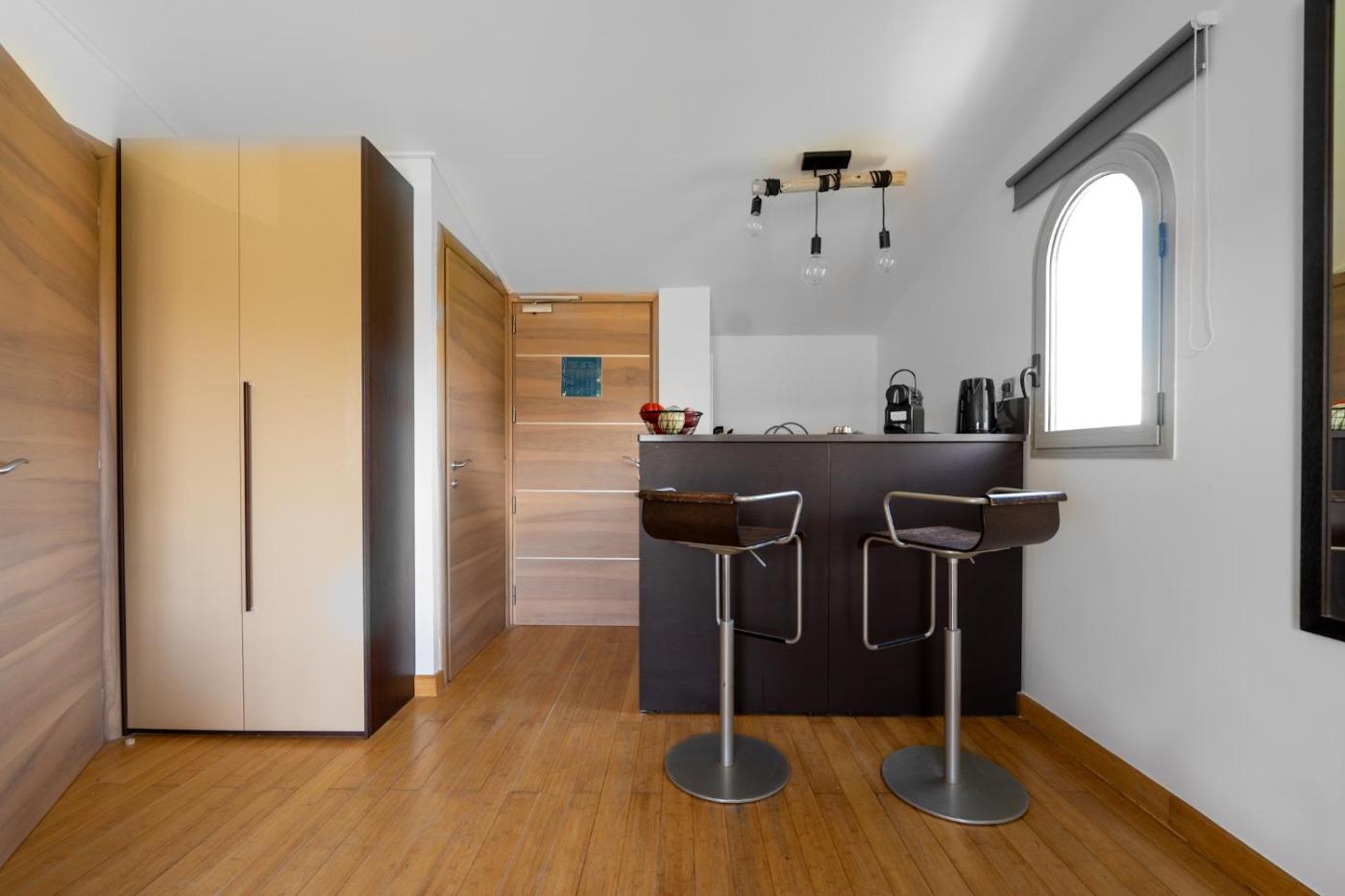 Studio with Terrace. The studio provides air conditioning, a washing machine, as well as a private bathroom featuring a walk-in shower and a hairdryer. Guests will find a refrigerator, kitchenware and a microwave in the kitchenette. The studio also offers a barbecue. The studio features parquet floors, a seating area with a flat-screen TV, a private entrance, a tea and coffee maker as well as city views. The unit offers 1 bed.